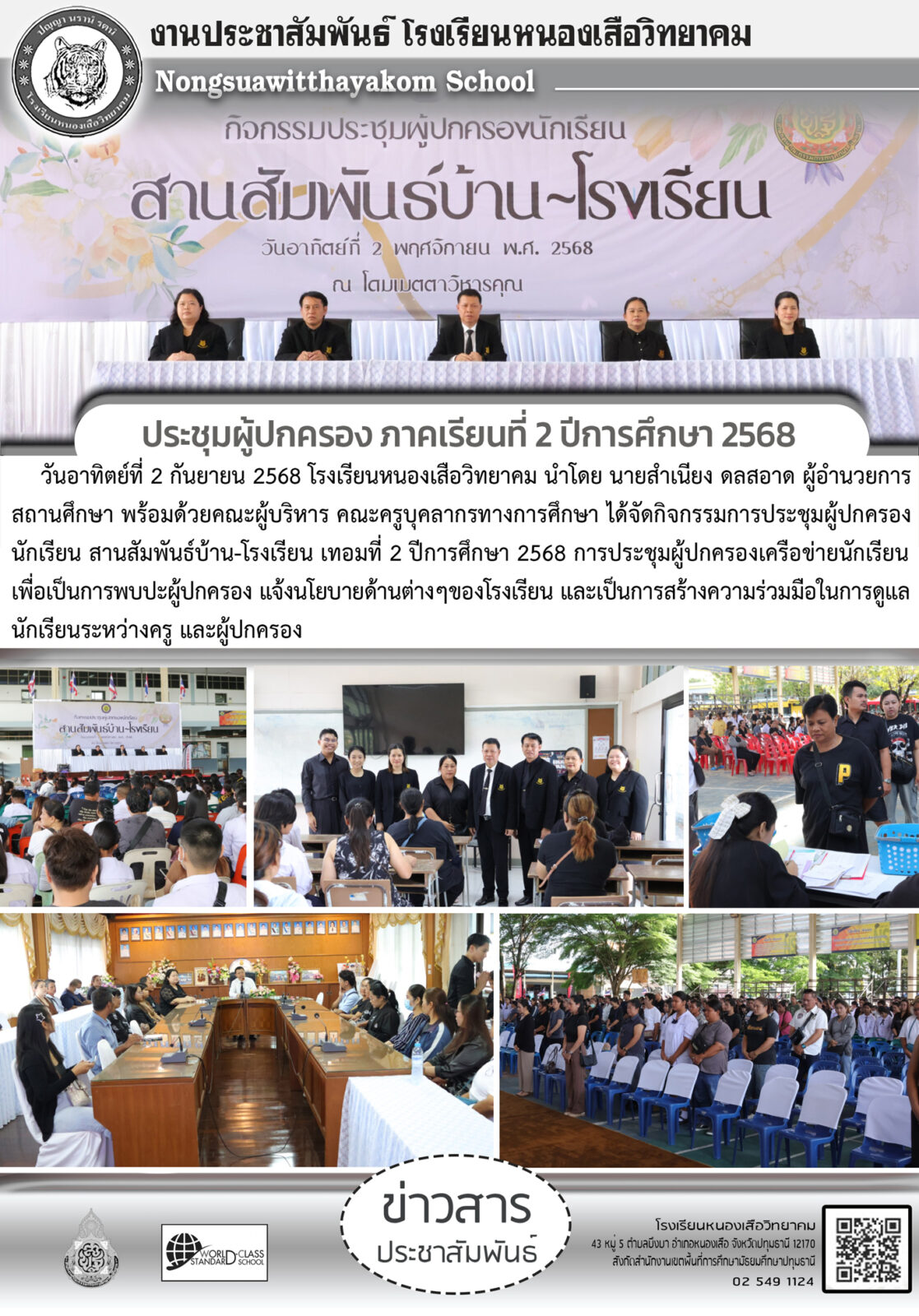 โรงเรียนหนองเสือวิทยาคม จัดกิจกรรมประชุมผู้ปกครองนักเรียน สานสัมพันธ์บ้าน-โรงเรียน ภาคเรียนที่ 2 ปีการศึกษา 2568 ณ โดมเมตตาวิหารคุณ