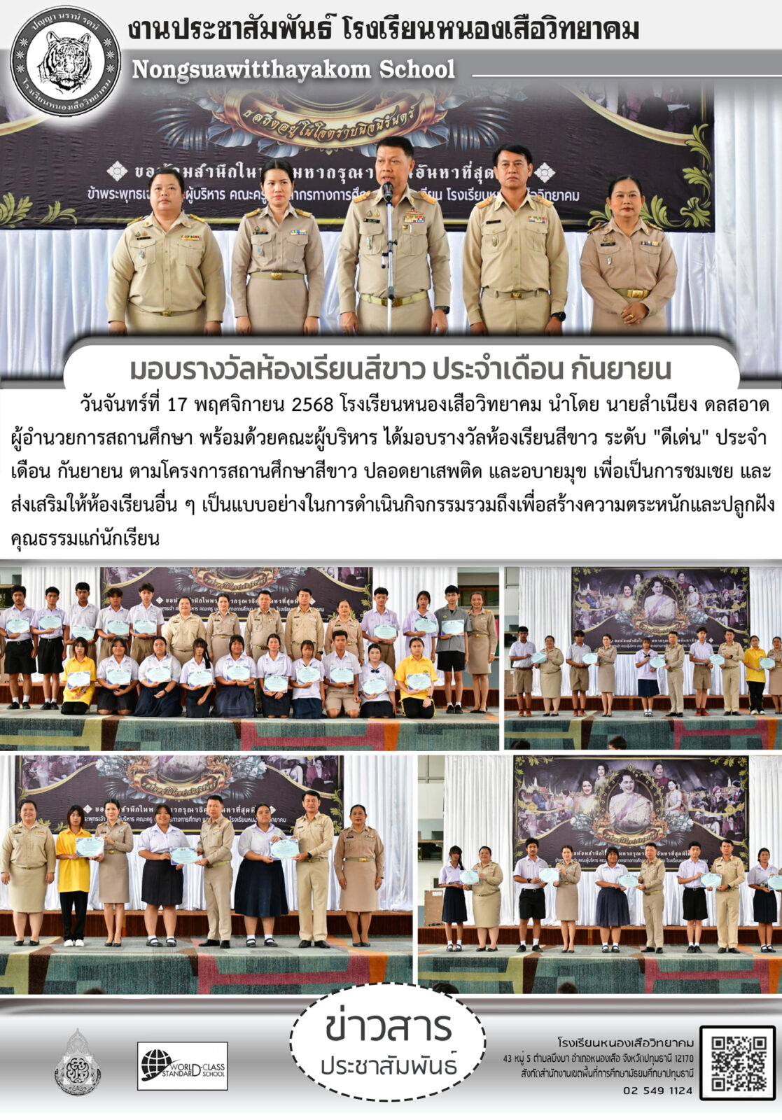 โรงเรียนหนองเสือวิทยาคม จัดพิธีมอบรางวัลห้องเรียนสีขาว ดีเด่น ประจำเดือนกันยายน ตามโครงการสถานศึกษาสีขาว ณ โดมเมตตาวิหารคุณ 17 พฤศจิกายน 202518 พฤศจิกายน 2025จักรกฤษณ์ ทุยบึงฉิมข่าวสาร FacebookTwitterLine