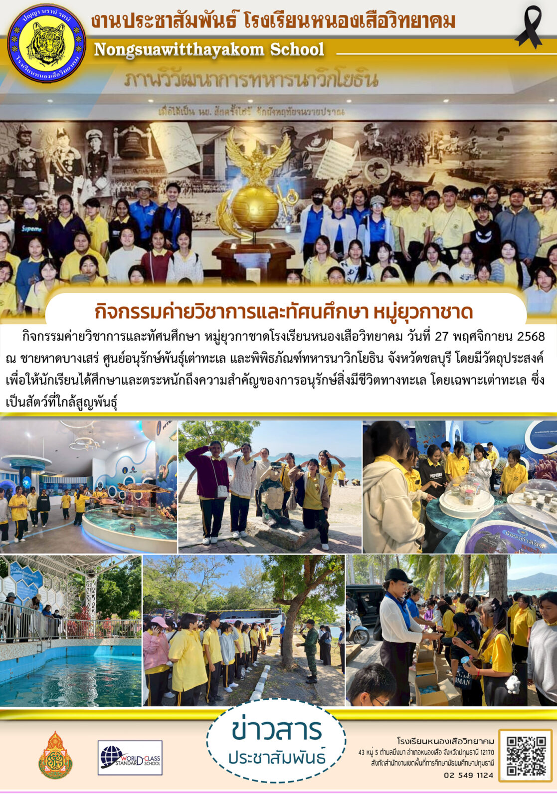 โรงเรียนหนองเสือวิทยาคมจัดกิจกรรมเข้าค่ายวิชาการและทัศนศึกษา หมู่ยุวกาชาด ประจำปีการศึกษา 2568 ณ ชายหาดบางเสร่ ศูนย์อนุรักษ์พันธุ์เต่าไทย และพิพิธภัณฑ์ทหารนาวิกโยธิน จังหวัดชลบุรี 29 พฤศจิกายน 20254 ธันวาคม 2025จักรกฤษณ์ ทุยบึงฉิมข่าวสาร FacebookTwitterLine